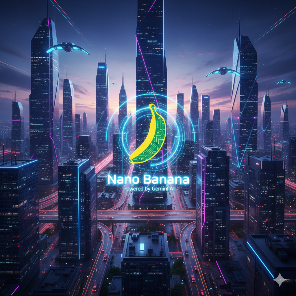 Prompt: “A futuristic city skyline at dusk, with flying cars zipping between towering, glowing skyscrapers. In the center, a holographic projection of the Nano Banana logo (a stylized banana with a circuit board pattern) shimmers brightly. The overall mood is vibrant, high-tech, and optimistic, with a deep blue and purple color palette.”